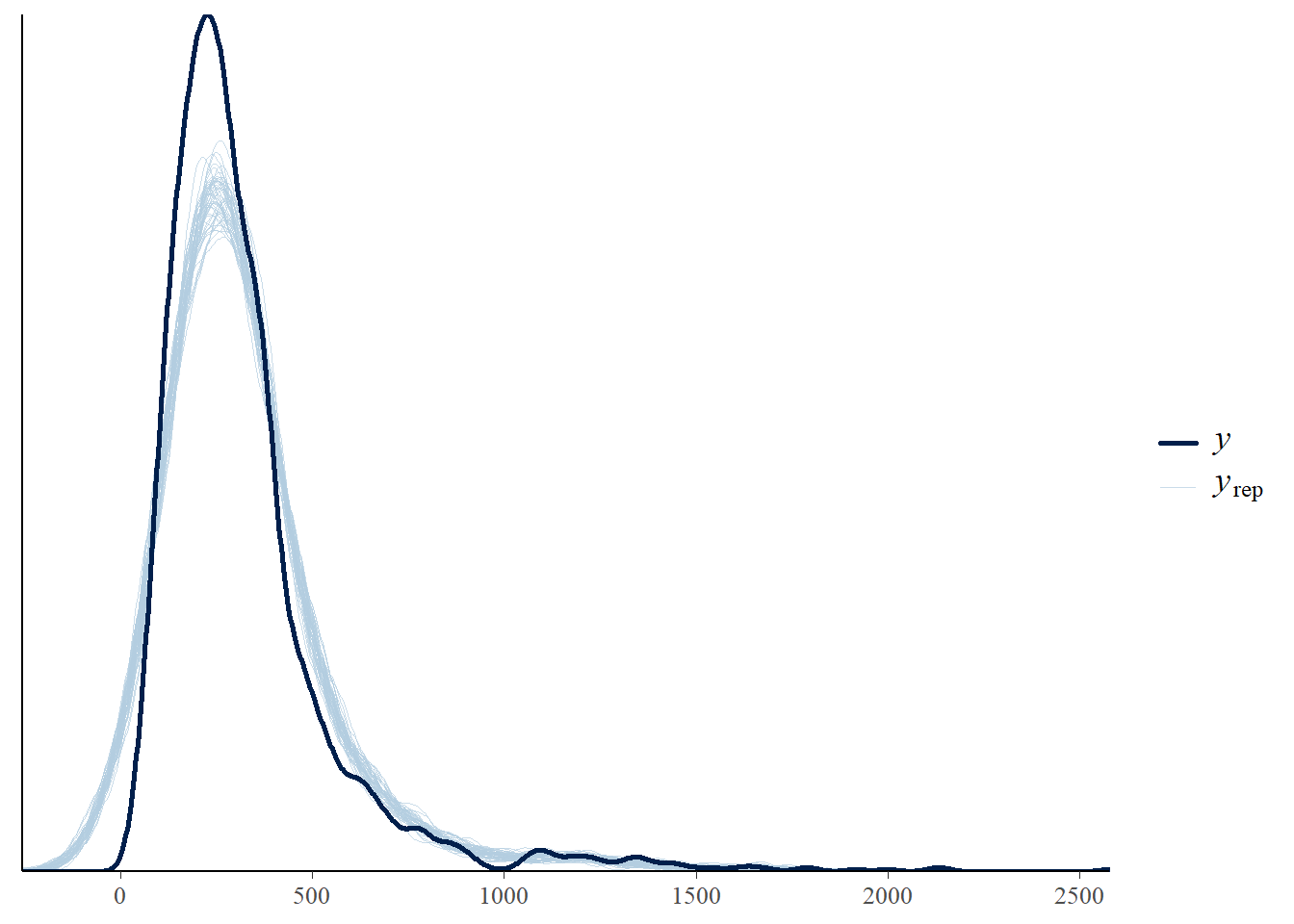 m_multi_2 <- update(m_multi, formula. = . ~ . + I(age^2))Now run through the checks as above to evaluate this new model. If all seems to be reasonable, we can consider at this stage if we believe one model to be “better” than the other. The posterior predictive check is useful for this.