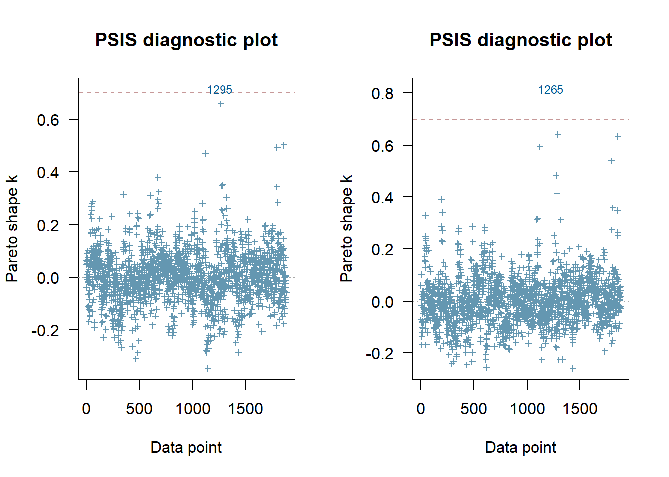 loo_m_2 <- loo(m_multi_2)Now we have evaluated the loo cv, we can view the diagnostic for each observation as it was left out. This helps to understand the leverage of different observations - similar to cook’s distance that is often used.