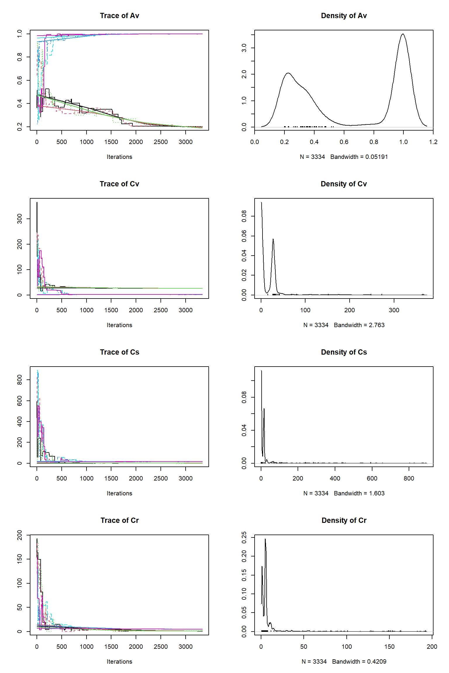 Running DEzs-MCMC, chain 2 iteration 9300 of 10002 . Current logp -8328.507 -8312.361 -8329.297 . Please wait!