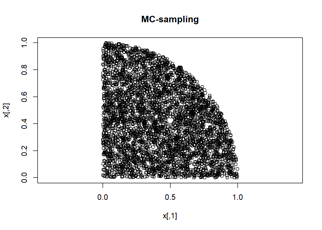 Say we want to sample from a distribution p(x) that is bivariate, and is uniform within the overlapping area of the unit square and the unit circle. We can use MC to sample from that using the following code.