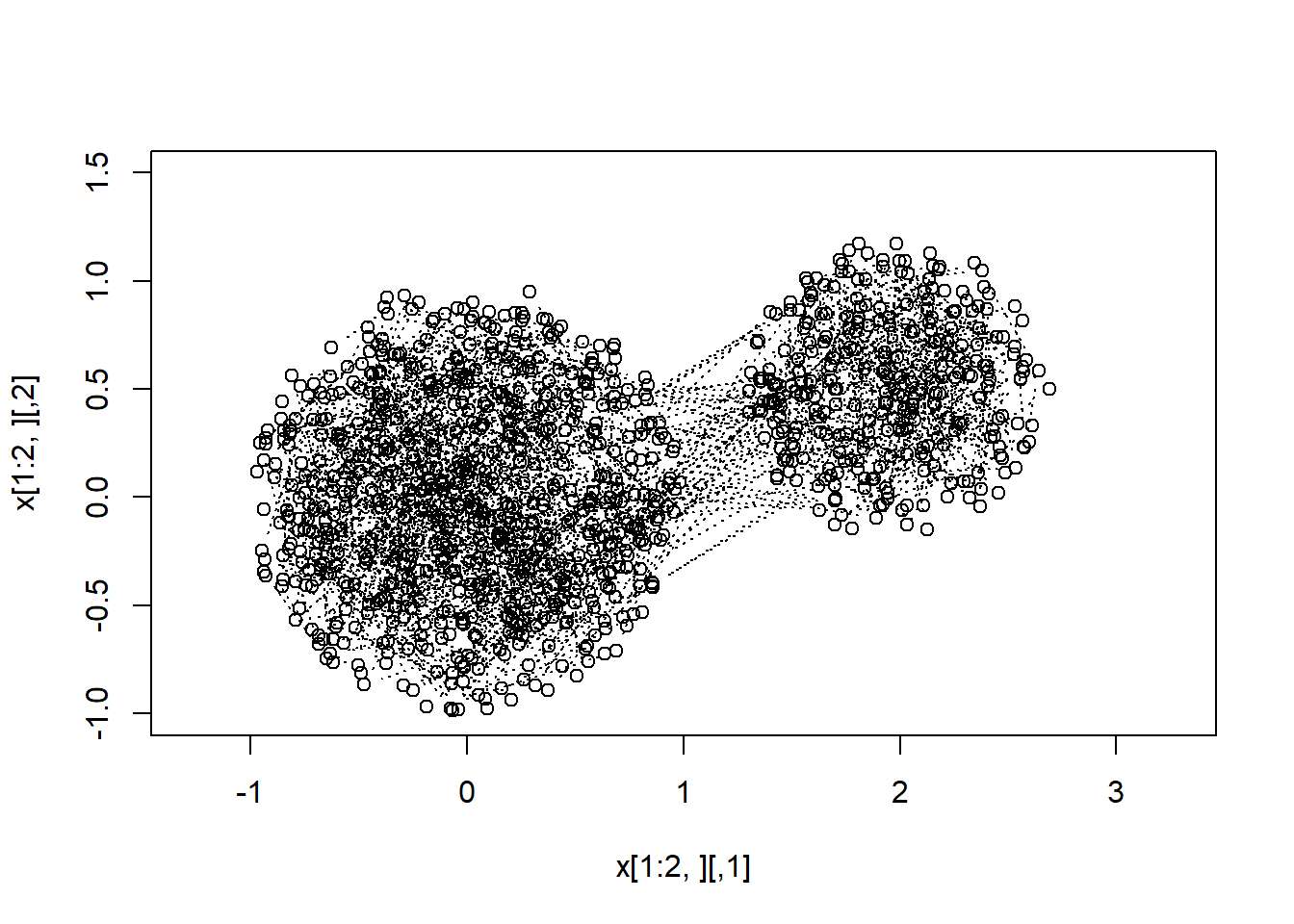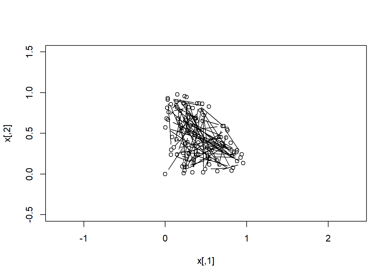 plot(x[1:2,],xlim=c(-1,3),ylim=c(-1,1.5),asp=1) ; lines(x[1:2,],type="b")