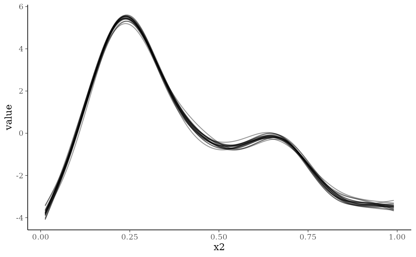 To demonstrate some of the smoothplot options, here we’ll plot the average smooth from 1000 draws for the first smooth (not the random effect):