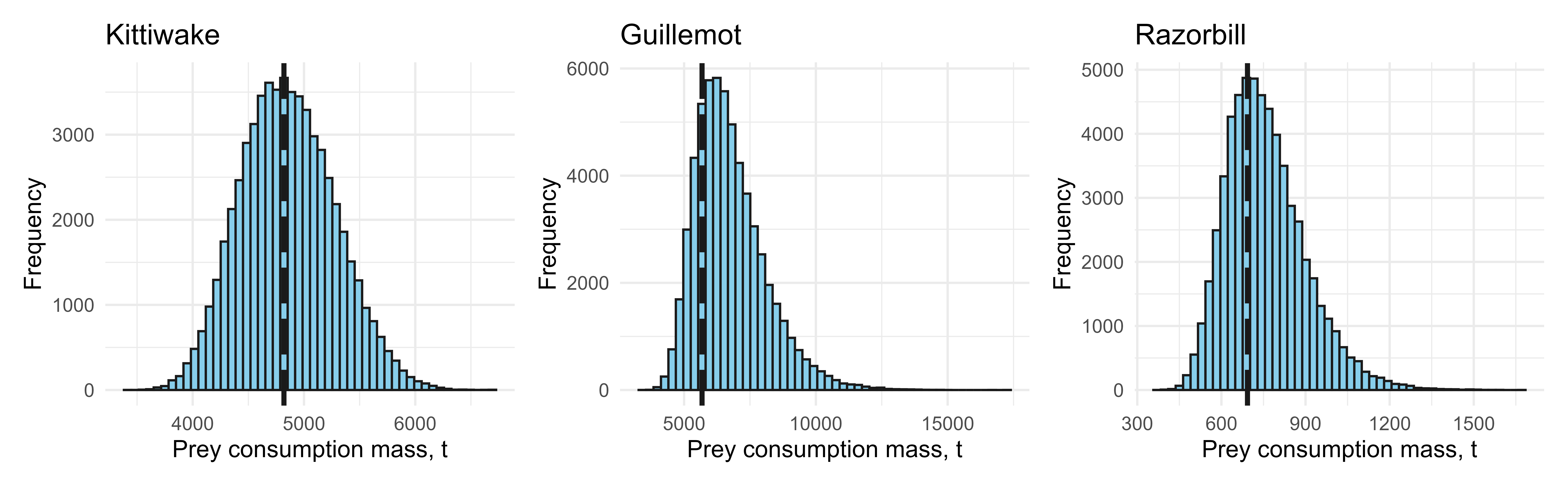 labs(x = "Prey consumption mass, t", y = "Frequency", title = "Razorbill") +