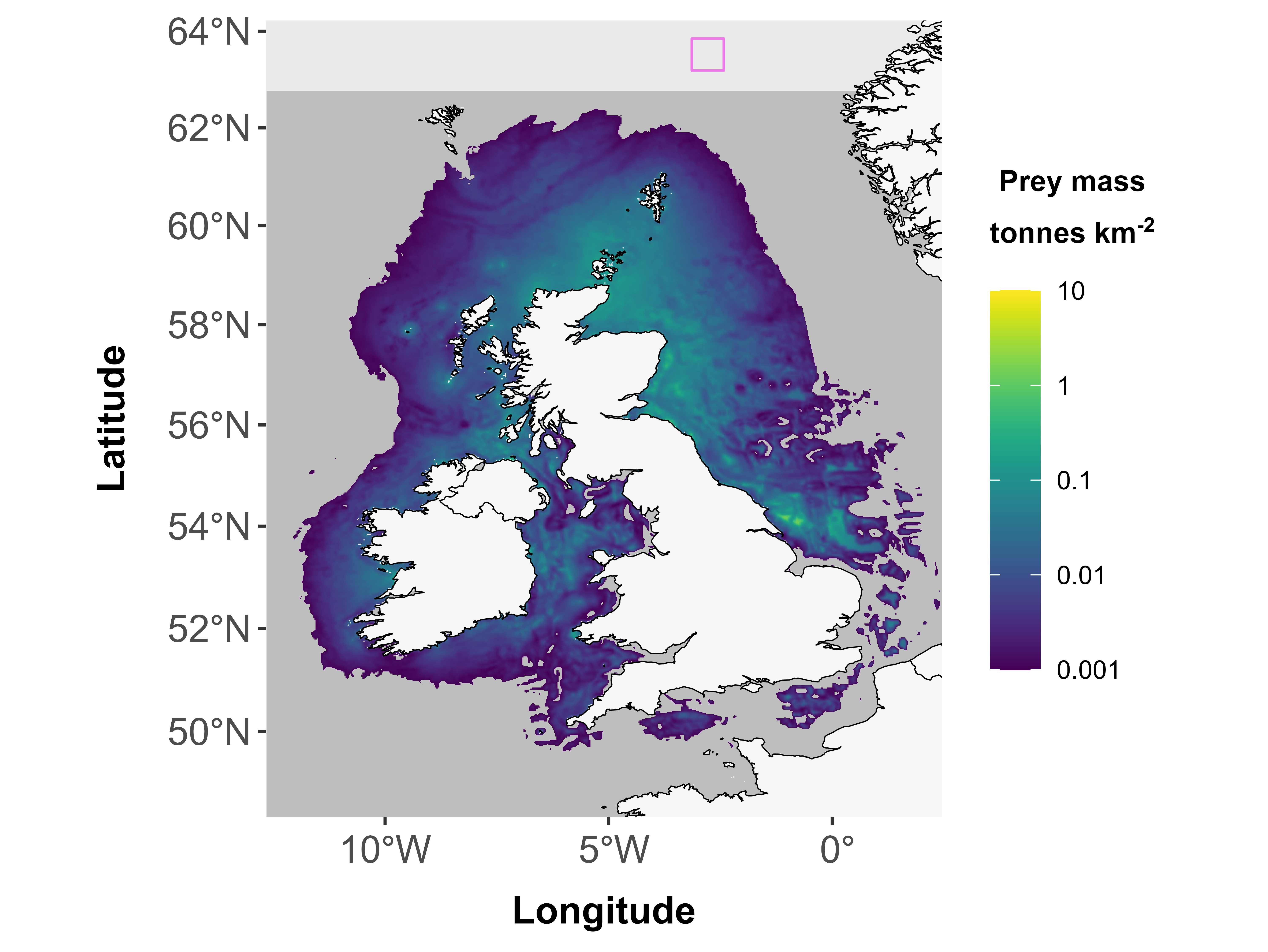spmapplot() takes two arguments, the first is a prey consumption map (raster, generated by spmapper(), contained in list outputs in the form out$Kittiwake$prey_cons_map), the second optional argument is a polygon object (e.g. the user’s polygons, fppolys)